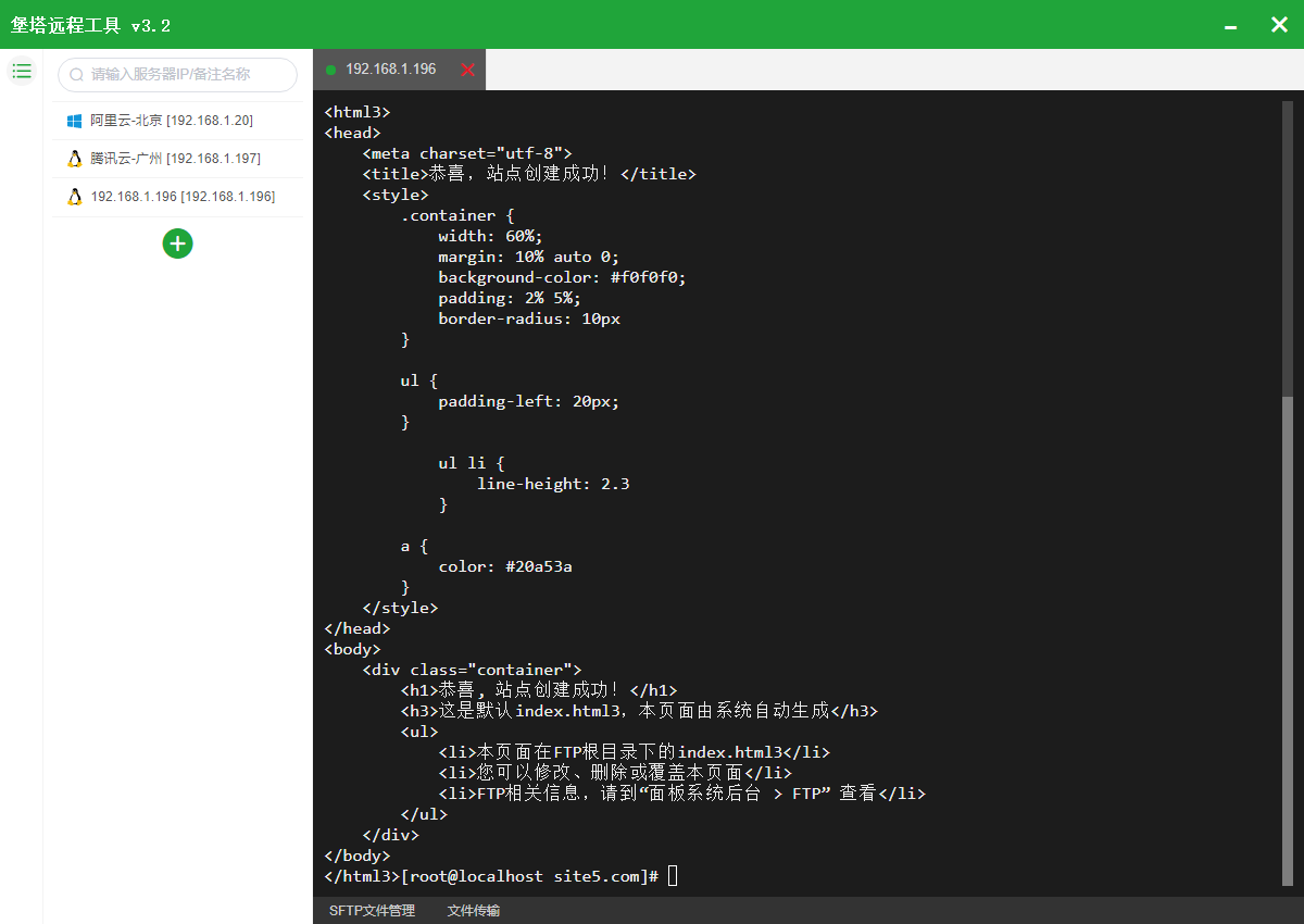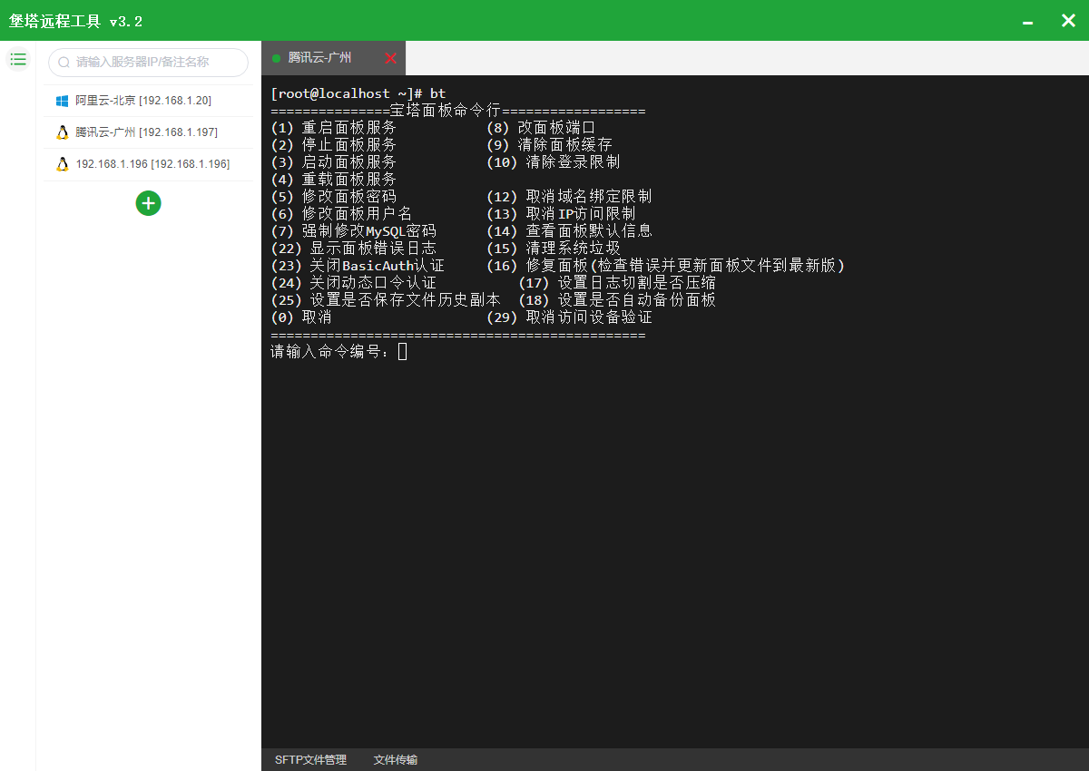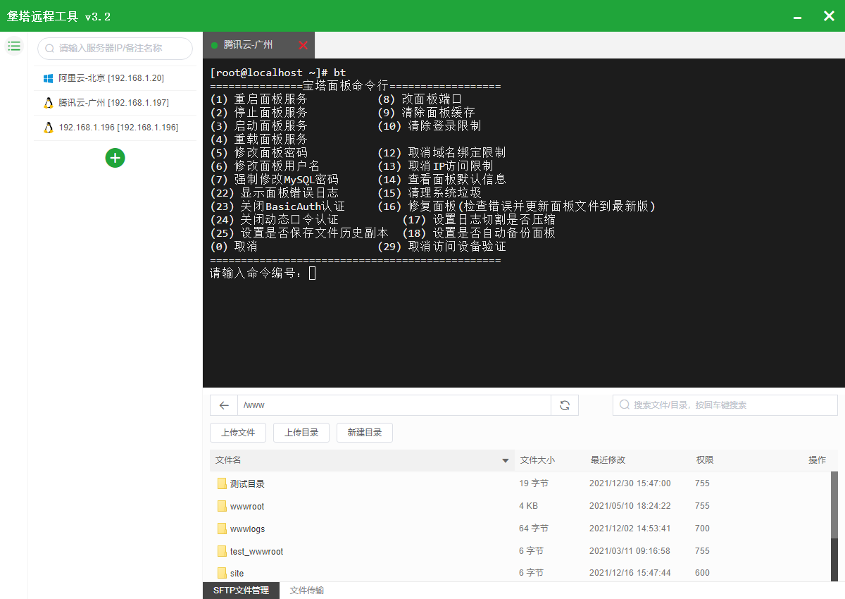 堡塔终端是一款同时支持SSH和SFTP客户端的免费软件,你可以在同屏切换SSH和SFTP界面,使用命令行的同时还可以快速上传或下载文件,非常方便。
