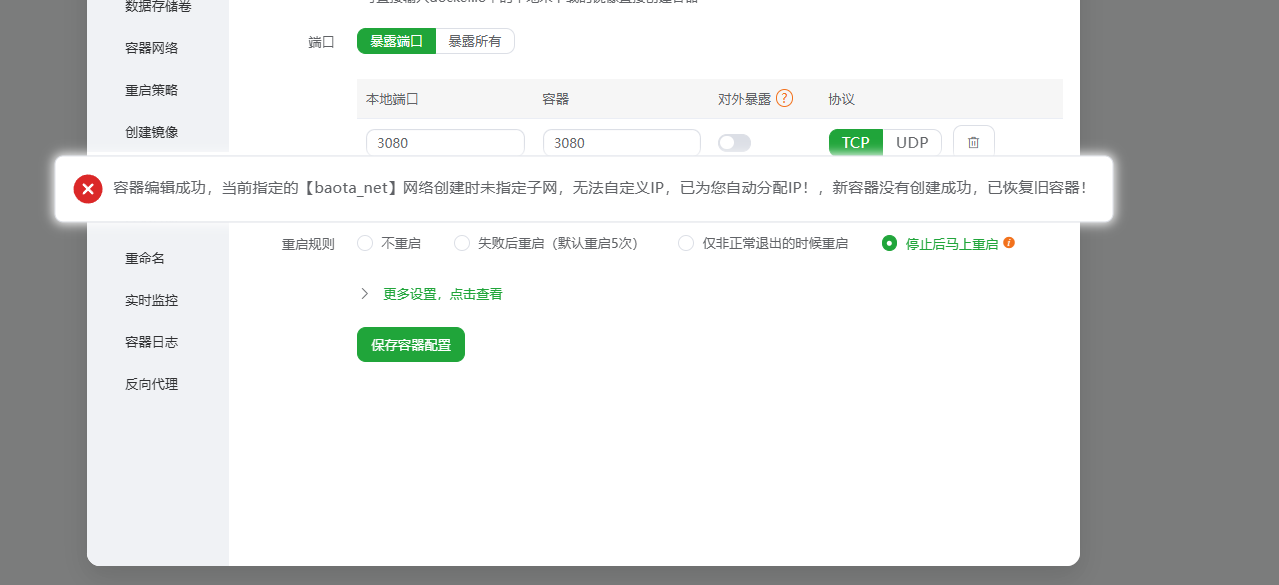 随便安装一个docker容器后,编辑容器里关闭对外暴漏会出现:容器编辑成功,当前指定的【baota_net】网络创建时未指定子网,无法自定义IP,已为您自动分配IP!,新容器没有创建成功,已恢复旧容器!