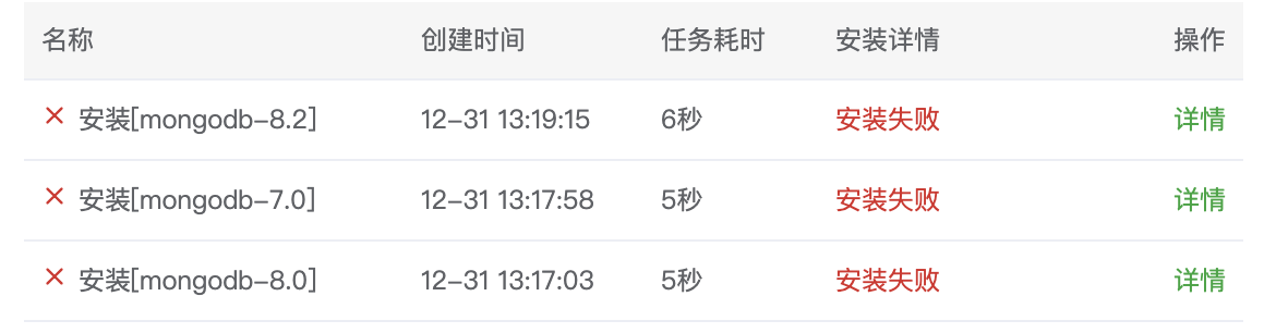 2025-12-31 13:19:17 (510 MB/s) - ‘mongodb.sh’ saved [14075/14075]https://download.bt.cnURL transformed to HTTPS due to an HSTS policy--2025-12-31 13:19:19-- https://download.bt.cn/install/public.shResolving download.bt.cn (download.bt.cn)... 115.231.130.125, 211.99.112.70, 240e:f7:ef00:3:0:7:8000:125Connecting to download.bt.cn (download.bt.cn)|115.231.130.125|:443... connected.HTTP request sent, awaiting response... 200 OKLength: 5745 (5.6K) [application/octet-stream]Saving to: ‘/www/server/panel/install/public.sh’ 0K ..... 100% 208M=0s2025-12-31 13:19:19 (208 MB/s) - ‘/www/server/panel/install/public.sh’ saved [5745/5745]您当前的服务器系统版本不在兼容范围,请使用主流的服务器版本安装使用。例如: Centos、Debian、Ubuntu系统|-Successify --- 命令已执行! ---